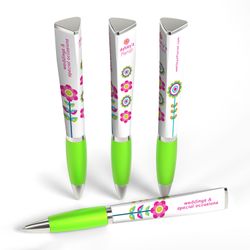 The Original Performance Pen™ combines modern design with exceptional functionality.This unique ballpoint pen offers a dynamic branding experience offering a 360 degree imprint around all three sides of the triangular barrel for smooth writing with a stylish twist! SIlver accents, colored barrel.Twist action. Medium point black ink..